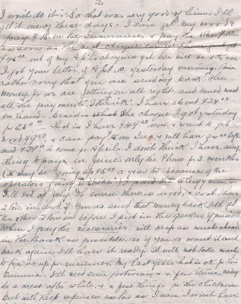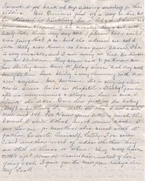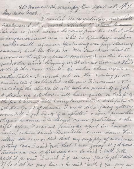 I mailed No. 24 yesterday, and shall likely send this with Shirley to school to- morrow. The box is just across the corner from the school, which is very convenient now. This is Sunday - and is rather dull again. Yesterday was fine & sunny & warm, but in the p.m. Mr. Faulkner had to burn a heap of straw (manure) in his back yard, & the wind was blowing right across here so I had to keep the door shut - the ashes blew right in on the table I went out in the evening for 10 minutes & collected all our tin cans - & raked up the sticks. It will not be much of a job to clean up out there - will have quite a heap of chips to burn: we will bring them in dishfuls & get the good of them. I was delaying getting wood, till I got track of a "splitter" - & also for another cheque to come. The cheque came yesterday. & The night before, I was out fixing the spout in case of rain, when friend Burchill came down the alley. He remarked that my supply of wood was getting low, & I said "yes" that I was going to get some Tamarac one of these days - & he said : Well. I'll split it for you." I said I'd be very glad to get it done if he'd let me pay him, & he said. "Well, if you pay me I won't do it." So that was very good of him. I'll get it one of these days. I can get my wood & pay $15 on the Insurance, & pay the other $12 as soon as the next cheque comes. I have just got $45.ºº out of my Ap'l's cheques yet. We will be o.k. now. I got your letter of Apl.10 yesterday morning. Am rather sorry that you are sending back the money for we are getting on all right and meet all the payments I think. I have about $ 24.ºº on hand - besides what the cheque I got yesterday for 25.ºº - that is I have $ 49.ºº now, & want to get wood $ 9.50, & can pay $ 15. on Ins, & will have $ 24.ºº left and $ 39.ºº to come for April. I don't think I have anything to pay in June, only the phone for 3 months (It may be going up $ 5.ºº a year too - because of the operators going to "strike".) I paid the Clergyman's till the end of July. Of course there is wood, & coal. I have 2 ton in, and if you do send that money back I'll get the other 2 ton in before I put in the garden, if possible. When I pay the necessaries, will keep as much ahead in the Bank as possible, so if you do want it sent back again I'll have it ready. It will not take much to fix us up for summer. My last year's hat is o.k. for this Summer - I'll need some footwear, & a few items, may be a dress after while, & a few things for the children, but will keep the expensees as low as I can. I won't have anymore expense for the house now, to speak of - just a bit of curtain stuff for the kitchen shelves - I have the kitchen done except that. The smell of paint is fierce - Tho dying down a little now, it's all done. I Kalsmined it - gave all the wood work one coat put white oilcloth behind the sink & grauwted the sink white - white oilcloth on the table & trunk, painted the "little green" chair gray like the walls - & gave the woodbox a coat of that for the verandah floor. - and gave the trunk & pipes a coat of aluminum. It looks pretty fair now - clean anyway. I have the parlor & dining room curtains to fix up and a few odds and ends to do, and then I guess the clearing will be about done. I have not the storm windows or doors off - only I took off the front bedroom one myself - & we had the middle bedroom one off when they had the measles. I'll get Mr. Burchill to take them off when he comes to do the wood. You-know-some folk that offer help make one tired - the man next door - Faulkner - always offering to do anything - but never doing a thing. Am sure he knows the windows are to come off - when he took his own off - but never asked if he could. I suppose he'll do it all right if I asked him, but Mr. Burchill's way suits me better. Mr. Gunn will likely speak of them, but I am reserving him, in hopes he'll do the garden again. I want to get back at my spring sewing for the kiddies. Mrs. Gunn is just up a day or two, but her stomach is troubling her a lot yet. I have not been over - because of the measles. Ray & Mel will likely take them any day now. I phoned her & said I was going that p.m. - but she advised me not to take Billy near them - so I was quite pleased. She is very sensible, and I am sorry we had the trouble over the children. They never ask to go there - nor has Shirley been there to play since that day [?] brought them home. Shirley is very chummy with the new neighbor - Mrs. Foreman. She is staying alone now too - since he is in the Hospital. & Shirley goes in after tea every evening & stays an hour or more. I think she likes to see her feeding the baby ("titty") & bathing it. Well, its time to eat a bite now, and I'll look over your letter & finish this I want to write to that aunt down east - I owe her one for months: also must write to Father - he wrote himself lately. I've never heard another word of Adds, whether they are still at Lenas or where. They may have settled right down at Assiniboia, instead of here going east, I gave you the news from Rubys in my last.