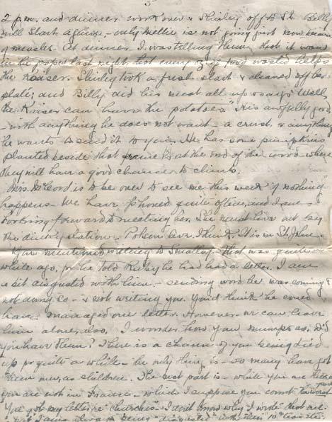 2 p.m. and dinner work over & Shirley off to S.S. Billy will start again - only Nellie is not going just now because of measles. At dinner I was telling them that it was in the paper last night, that every oz. of food wasted helped the Kaiser. Shirley took a fresh start and cleaned of her plate; and Billy did his meat all up & says "Well the Kaiser can have the potatoes." He's awfully good - with anything he does no want - a crust & anything he wants to send it to you. He has some pumpkins planted beside that frame at the end of the wood - where they will have a good chance to climb.