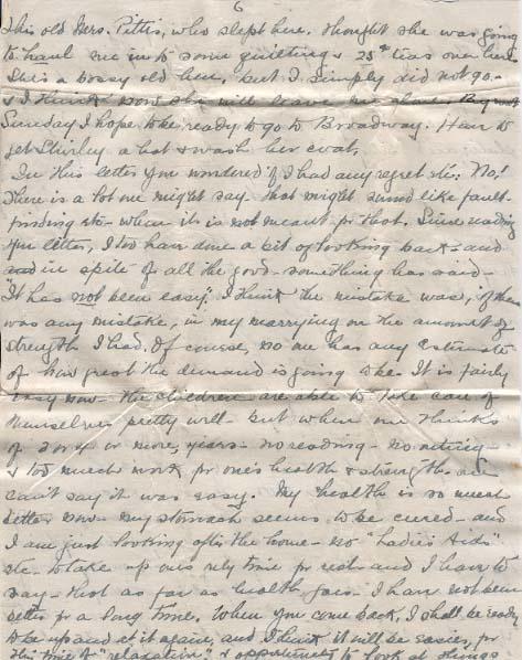In this letter you wondered if I had any regret etc: No! There is a lot one might not say - that might sound like fault-finding etc - when it is not meant for that. Since reading you letter, I too have done a bit of looking back, and in spite of all the good - something has said - "It has not been easy." I think the mistake was, if there was any mistake, in my marrying on the amount of strength I had. Of course, no one has any estimate of how great the demand is going to be. It is fairly easy now - the children are able to take care of themselves pretty well - but when one thinks of 3 or 4 or more years - no reading - no [?] - & too much work for one's health and stress tho' one can't say it was easy. My health is so much better now - my stomach seems to be cured - and I am just looking after the home - no "Ladies Aids" etc - to take up ones only time for rest - and I have to say - that as far as health goes - I have not been better for a long time. When you come back I shall be ready to be up and at it again, and I think it will be easier, for this time of "relaxation" & opportunity to look at things from a distance, & getting their true lie. Now, my worry is about you, and I am longing for & looking forward to you coming home & confidentially counting on it being before another winter. We would better try to forget regrets and everything that has not been as we wished, and now with our little family, past the baby stage - make the days that are to come what we once dreamed they would be. You are different to me: even a joke, is flat to me if I have it all to myself - I enjoy it when I tell it to someone else & we laugh together- in fact - I am afraid I'll have Shirley old before her time- trying to share up with her - even to reading parts of daily paper to her - but you keep things all bottled up - and we are all "outside". Do not take any of this as faultfinding: It is just a little of how things have appeared to me: and I may not see aright either when you get this, if you are where you can write, keep me wherein I am astray.