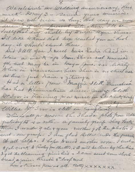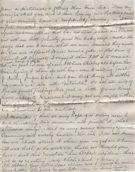 I do wonder if there is any hope of it ending soon. I keep thinking this summer will finish it. What is Russia doing? - and so very many turning against Germany will surely hasten the end. I do not know how we will stand it when you do get over to France - it was hard, for the week & a half we thought of you there- but this "reaction" had helped: only then - there will be no "reaction" - only to hope, trust & pray - I'll stop now: Your letters come oftener now. I fancy the [?]. Seems happy to be going re your letters, Even he always chat a minute.