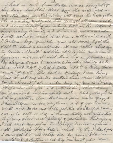 I had a note from Bella. Am so sorry that they have lost their little boy. She wrote just a note the day he died, They will miss the little fella She said they would see that you got all you need etc. And I am sending an order for $10ºº in the letter I have ready to mail, and can send more as needed. I will not send much at a time, & will send it in P.O. Orders - to go quicker. You will know I got the $125ºº about 6 weeks ago - It was rather slow of the Union Bank not to be able to find me when I have an account with them - & a phone. My cheque come to-morrow (Patriotic $24ºº) - so I can send $10ºº of that to Bella. & $5ºº to Ruby For a crock of butter She sent on Friday. I am trying hard to get my winter butter - have written Mrs. McIvor and if she can't may try Mrs. Wood (keep I hope I can get a crock or two. I had to by one pound at Eatons & paid 42¢. Ruby charged 30¢ I have written Abe Baldron for a crate of eggs I have 8 dozen in water glass but if you come we'll need more so I'll get the crate if I can & may be sell 4 doz. I have 3 doz. not pickled They say there are plenty of potatoes this year I will send my order to George Gunn again & get perhaps 7 bushels - what we had last year - my get 8 - an extra one for you. We are using our potatoes - but they are small yet & I don't think I'll pull any more for a while - may by another quarters worth - to do a couple of weeks. We can use the carrots & beets now. To-day it is turning quiet cool again. The sort of weather one fancies fried potatoes, for tea etc.