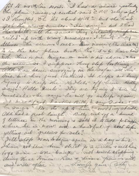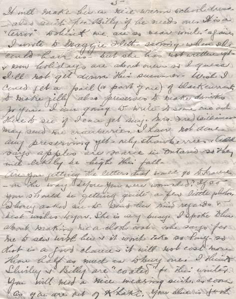 Are you getting the letters that would go to France - on the way before you were wounded? If so you should be getting quite a few little photos Thorey asked me to send her kind regards & best whishes to you. She is very busy. I spoke to her about making me a[?] coat. & she says for me to sew with her & it won't take so long - so that is a good chance & it will not cost more than half as much as to buy one. I think Shirley & Billy are "coated" for this winter You will need a nice wearing suit as soon as you are out of Khaki. Your blue is just fit to work in now. I had a scare yesterday the phone rang & central said "C.P.R. Telegraph" & I though "Oh its about Will" but she had got the wrong number. "I'm sorry" - but I had the "chill," all the same. They certainly keep me "riled" up with wrong messages. I think they deliver the serious ones. No Name (Rev. A.W.M) is in the new phone book - tho' 546 have same not. There is one Mayes an inch or two above - & no other near - so I suppose they stop looking. Add has been snoozing on the sofa all this time but has just wakened. It keeps me busy trying to keep the kidlets off him. Billy says "Hello Uncle" - They are trying to bite his mustache & he says he will go asleep again at breakfast. I asked Billy to say Grace & he says "No - its up to him" nodding at Add. Add had a great laugh. Billy cut off a bunch of lettuce in the morning & sold it to Add for 5 coppers & here he is now with a handful of beet tops yelling out "Greens For Sale."