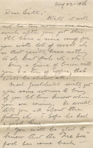 Well it will not be long now - one more week after you get this. I'll have a nice camp for you with lots of wood etc so that you'll have nothing to do but fish etc - etc.