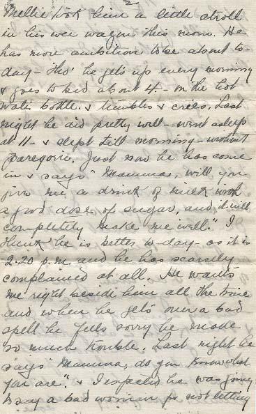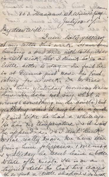 I am late getting at my letter this week. Have been having a bad time with Billy. He is still sick. Tho' I think he is getting a little better to-day - In fact he is at Gunn's just now - his first outing for a week. Dr. McRae was here yesterday morning to see him. He does not say what is wrong (something in the bowels) but yesterday said it might be a swollen gland like he had a while ago - He has no temperature - & it is not the appendix, so I don't think McRae really knows. We have been giving him pliysies, & enemas, & yesterday he sent a bottle to take after meals. He is on a liquid diet. The last two days he is just a little shadow - & so weak. Nellie took him a little stroll in his wee wagon this morn. He has more ambition to be about to-day - tho' he gets up every morning & goes to bed about 4 - on the hot water bottle & mumbles & cries. Last night he did pretty well - went to sleep at 11 - and slept till morning - without paregorie. Just now he has come in & says "Mamma, will you give me a drink of milk with a good dose of sugar, and it will completely make me well." I think he is better to-day - as it is 2.20 p.m. and he has scarcely complained at all. He wants me right beside him all the time and when he gets over a bad spell he feels sorry he made so much trouble. Last night he says " Mamma, do you know what you are" and I expected him to say a bad woman for not letting him have any bread & butter - but he says - "You are a good, kind, noble soul, and I could not live without you." Wherever he got the words, - I don't know. He drinks nearly a quart of milk a day- & likes a lot of sugar in it. He was telling me this morning that when he ate up the sugar in the bottom of the cup, it just made a new man out of him. It is when they are sick one gets to know all these funny little thoughts. I had to load my supper on a tray last night & eat in there. He his with his head up on me - like Maggie taught him - but he has been better at night the last 2 nights. Two nights I had to give him pargorie to get him to sleep - at 2 a.m. I was nearly done out & am feeling very tired yet. I see that he is far better to-day. I give him just milk & lime water. I phoned Mrs. Hargrave this a.m. to speak of the mail - & I was telling her about Billy - did not know that Mr. H. was a doctor. So she told me he was a Dr. for 30 years & she is going to send him over to see Billy - perhaps to-day, & if I just said the word Dr. Furgeson would come, he does not like to when another Dr. is on the case. McRae is very nice & attentive now, but some way I don't like him.