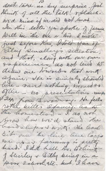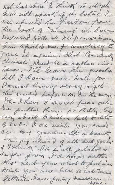 In this letter you spoke of farms. Well in the one or two I wrote just before this, I told you of Riley Smalley's situation, and that, along with our own experiences, do not tend to draw towards that work again. He is simply stranded here - saved nothing, moved so often - no presentations - except $24, from Broadway. He feels rather bitter I fancy. As to the homestead - I do not know how we'd stand the hardships & work. The least bit over the line here lays me up - & farming is pretty hard. I'd hate too, to think of Shirley & Billy being in a poor school, etc. but I have not had the time to think it out yet, but will speak of it later. I am afraid the freedom from the sort of "misery" we have endured both at Neepawa & Emerson has spoiled me wanting to face it again. That ‘Community Church" would be a rather nice idea, I'll leave this question till I have more time for I have to hurry along, & get this mailed before 10 in the morn. Oh - I have 3 sweet peas out - We pulled them for Billy. Are only about 6 inches tall & lots of buds. I do wish you could see my garden - It's a beauty - away ahead of all but Jones' & I think his is all potatoes & a few peas, I'd know better tho' next year what to put in. Wish you were here to eat the lettuce. I am giving Faulkers some. My mind has been so "strained" with Billy, I hardly know what I have written. It is such a treat to see him, & Shirley too, sound asleep - often the last week - when it was 2 a.m. - so often & then such tossing. I hope the poor little chap is on the mend. You'd feel sorry to look at him, such a thin little fellow. Oh - I nearly forgot - I think I'll take them up to Ruby's for 2 weeks, she wrote yesterday telling me to, & for Billy's sake I think I shall, tho' I don't really want to go, I think it would be best for him. I'll hate coming back to the lonely cottage if I have to leave it.