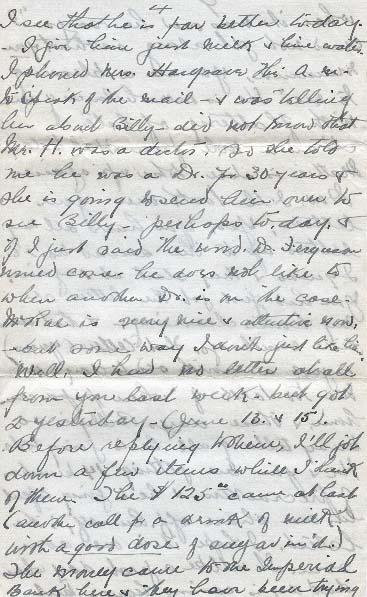 Well, I had no letter at all from you last week - but got 2 yesterday - (June 13 & 15). Before replying to them, I'll jot down a few items while I think of them. The $ 125.oo came at last (another call for a drink of milk with a good dose of sugar in it.) The money came to the Imperial Bank here & they have been trying to find me ever since they say.. It strikes me one way would have been to ask Information if I had a phone. Any way it is here now & I asked the head of the Union Bank to transfer it to the Corydan Branch, so I had a letter from them yesterday saying it was there. This will have to make it easy for me to make the following payments & get them off the list.-