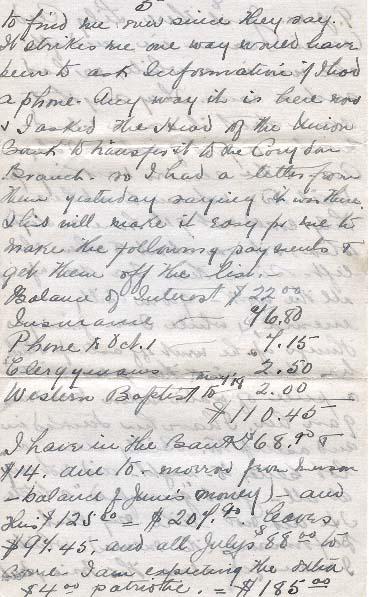 I have in the bank $ 68.90 & $ 14. due to-morrow from Emerson - balance of June's money - and this $ 125.00 = $ 207.90 leaves $ 94.45, and all Julys $ 88.00 to come. I am expecting the extra $ 4.00 patriotic, = $ 185.00. That will be a good nest egg. Between now & Thurs, I have to pay