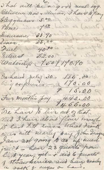 We have to live out of that and I have about flour enough to last till Xmas. What Frank owes will nearly pay John George. I am not going to do up much fruit - have 23 quarts from last year, yet - & did 6 quarts of strawberries and have nearly a sack of sugar on hand. So much for the Budget.