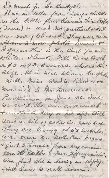 Had a letter from Ruby - she tells me the little fair haired Miss Robb (Dena) is dead, no particulars. I am sorry to hear it. They were nice. Have 3 more photos to send, & I guess this is the last for a while. I think I'll have to get a $ 2 or $ 3. camera about this size. It is nice to have the photos.