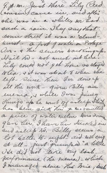 9 p.m. Just there Lily Reed (cousin) came in, and after she was in a while, we had such a rain. They say that down street it was a cloudburst - a foot of water on Portage Ave - & the severs backing up - Hail too - not much out here. Lily could not get home so stayed to tea, & it was about 8 when she left - since then I've done up all the work - given Billy an enema, & while I was fixing things up he went off asleep. Shirley has been sick this p.m. vomited of watermelon Mrs. Foreman gave her. I have her tucked in and asleep too. Billy seems a lot better to-night - did not cry at all - just "grumped" a little. He did not like my last performance (the enema) which I managed alone this time, but when it was all over he says - "I could not get along without you mamma, you are a blessing to me." He is overwhelming me with flattery of late.