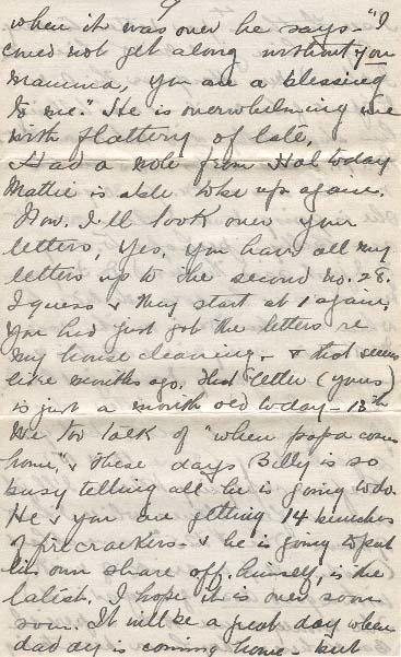 Now, I'll look over your letters, Yes, you have all my letters up to the second no. 28. I guess & they start at 1 again you had just got the letters re my house cleaning - & that seems like minutes ago. Had letter (yours) is just a month old to-day - 13th. We too talk of ‘when papa comes home," & these days Billy is so busy telling all he is going to do. He & you are getting 14 bunches of fire crackers - & he is going to put his own share off himself, is the latest. I hope it is over soon, soon. It will be a great day when daddy is coming home - but don't take us by surprise. Just think of all the talk - plans we'd miss if we did not know.