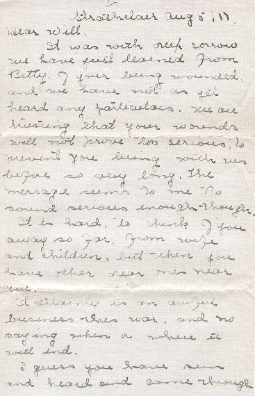 It was with deep sorrow we have just learned from Betty of your being wounded and we have not as yet heard any particulars. We are [?] that your wounds will not prove too serious; to prevent you being with us before so very long. The message seems to me to sound serious enough though. It is hard to think of you away so far from wife and children, but then you have other dear ones near you.