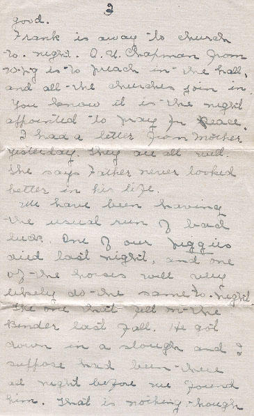 Frank is away to church to night. O.U. Chapman from W'n'g is to preach in the hall, and all the churches join in. You know it is the night appointed to pray for peace.