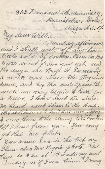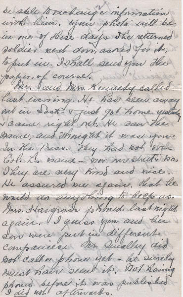 Mr. and Mrs. Kennedy called last evening. He has been away out in Sask. & just got home yesterday & came right out. He saw the [?], and thought it was you. In the Press - they had not even Col. His name - nor our street & no. They are very kind and nice. He assured me again, that he would do anything to help us. Mrs. Hargrave phoned last night again. I guess you and her son were put in different companies. Mr. Smalley did not call or phone yet - he surely must have sent it. Not having phoned before it was published I did not afterwards.