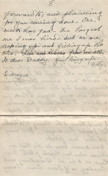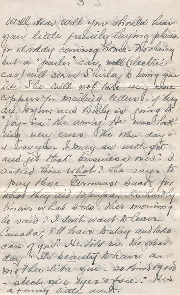 Well, dear Will you should hear your little family laying plans for daddy coming home. Nothing but a "parlor" car, (Eelectric car) will serve Shirley to bring you in. She will not take any more coppers for mailing letters - if they are to you; and Billy is going to "joy-in" the army. He was looking very cross the other day & says - I may as well go and get that business over - " I asked him what? He says to pay these Germans back for what they did to papa. He hardly knows what to do - this morning he said, "I don't want to leave Canada, I'll have to stay and take care of you." He told me the other day its beauty to have a mother like you - so kind & good - such nice eyes & face." He's a funny little duck." Shirley has been decorating the kitchen for you too, with little pictures out of fashion books of Thorey's. They expect you soon, and, how we are all wishing we could get you here. It is a comfort to know you are being taken care of, and we are now really looking ahead to when you can come home - even before the end of the war - tho' we long for that time, too.