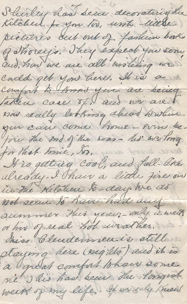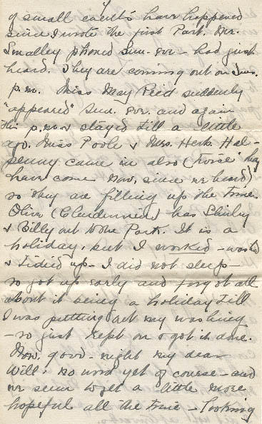 Monday,- I waited but the Eng. Mail will not be in till to-night so I'll mail this in the morning and write again in a day - A lot events have happened since you wrote the first Part. Mr. Smalley phoned Sun. eve - had just heard. They are coming out on Tues. p.m. Miss May Reid suddenly "appeared" Sun. eve. and again this p.m. & stayed till a little ago. Miss Poole & Mrs. Herb Halpenny came in also (twice they have come now, since we heard) so they are filling up the time. Olive (Cleudenman) has Shirley & Billy out at the Park. It is a holiday, but I worked - washed & tidied up. I did not sleep - so I got up early and forgot all about it being a holiday till was putting out my washing - washing - so just kept on & got it done. Now, good-night my dear Will, no work yet of course - and we seem to get a little more hopeful all the time - looking forward to, and planning for you coming home. One week has gone - the longest one I ever lived - but we are keeping up - and filling up the time. Love and kisses from us all to dear Daddy. Your loving wife