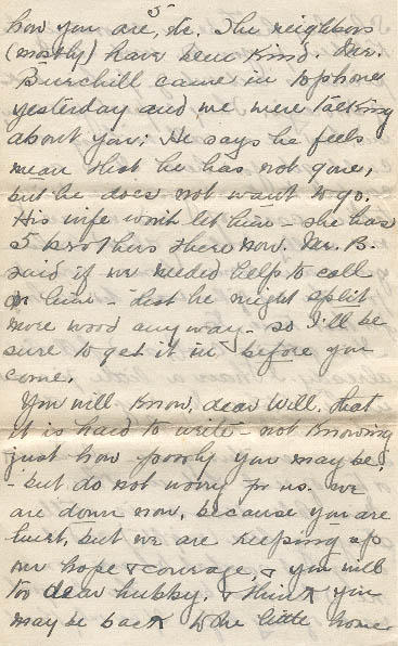 You will know, dear Will, that it is hard to write - not knowing just how poorly you may be - but do not worry for us, we are down now, because you are hurt, but we are keeping up our hope & courage, & you will too dear hubby, & think you may be back to the little home soon, Mr. & Mrs. Kennedy thought it was so cosy here.