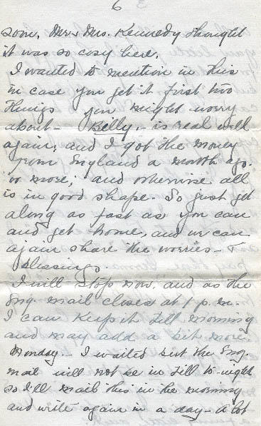 I wanted to mention in this in case you get it first two things you might worry about - Billy,- is real well again; and I got the money from England a month ago, or more; and otherwise all is in good shape. So just get along as fast as you can and get home, and we can again share the worries - & blessings.
