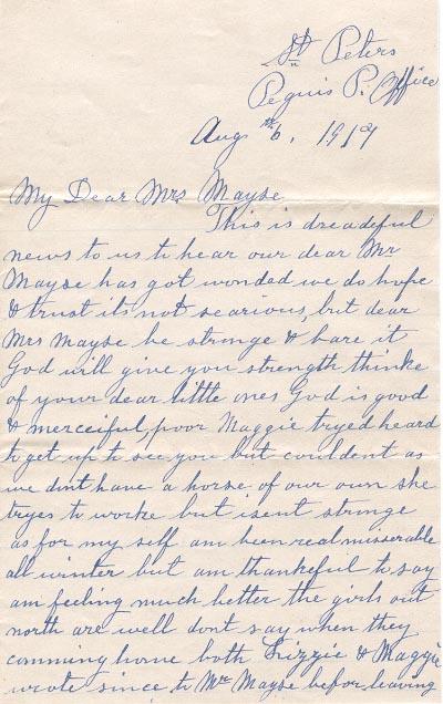 This is dreadful news to us to hear that our dear Mr Mayse has got wonded we do hope & trust its not searious, but dear Mrs Mayse be stronge & bare it God will give you strength thinke of your dear little ones God is good and merciful, poor Maggie tryed heard to get up to see you but couldent as we don't have a horse of our own she tryes to worke but isent stronge as for my self am been real misseralbe all winter but am thankeful to say am feeling much better the girls out north are well dont say when they comming home both Lizzie & Maggie wrote since to Mr Mayse before leaving England but got know answer letters might have gone astray some thing like your letter to Maggie lay in the P.O. 10 days before she got it its a shame they seem so careless
