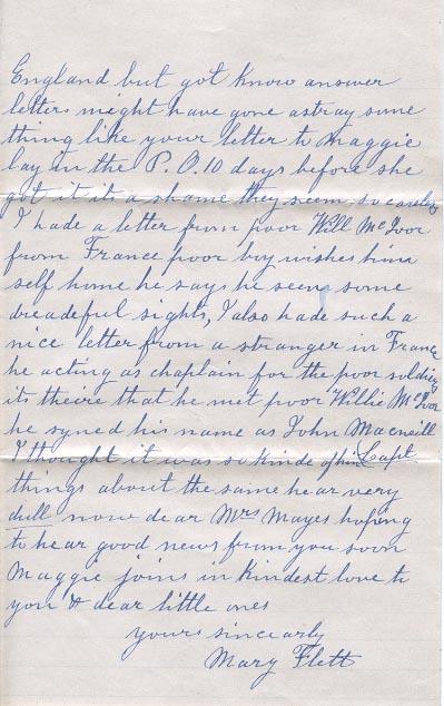I hade a letter from poor Will McIvor from France poor boy wishes him self home he says he seen some dreadful sights, I also hade such a nice letter from a stanger in France he acting as chaplain for the poor soldier its theire that he met poor Willie McIvor he syned his name as John MacNeill (Capt). I thought it was so kinde of him things about the same hear very dull now dear Mrs Mayse hoping to hear good news from you soon Maggie joins in kindest love to you & dear little ones.