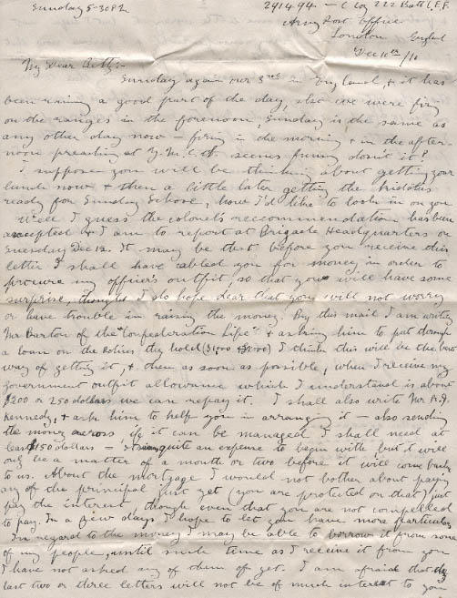 Well I guess the colonel's recommendation has been accepted - I am to report at Brigade Headquarters on Tuesday Dec 12. It may be that before you receive this letter I shall have cabled you for money in order to procure my officer's outfit, so that you will have some surprise, though I do hope dear that you will not worry or have trouble in raising the money. By this mail I am writing Mr Barton of the "Confederation Life" & asking him to put through a loan on the Policies they hold ($1,000 & £2000)I think this will be the best way of getting it, & then as soon as possible, when I receive my Government outfit allowance which I understand is about $200 or 250 dollars we can repay it. I shall also write Mr R.J. Kennedy, & ask him to help you in arranging it - also sending the money across if it can be managed. I shall need at least $150 dollars - It seems quite an expense to begin with, but it will only be a matter of a month or two before it will come back to us. About the mortgage I would not bother about paying any of the principal just yet (you are protected on that) just pay the interest, though even that you are not compelled to pay. In a few days I hope to let you have more particulars