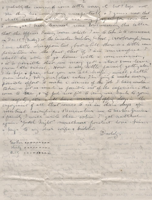 In regard to the money I may be able to borrow it from some of my people, until such time as I receive it from you I have not asked any of them as of yet. I am afraid that the last two or three letters will not be of much interest to you & probably the cause of some little worry etc but I hope not. The thing has come very unexpectedly & I guess now that I shall not be able to see my people for some time to come, as I have learned sence commencing this letter that the Officer's training course which I am to take is to commence on Dec 15th (Friday) at the Canadian Military School, Crowborough, Sussex I am alittle disappointed, but still there is a little compensation in the fact, that if I am successful I shall be able to go home with a commission, & it is possible that we may get a short X-mas leave from the School. How is my little family getting along? I do hope & pray that you are all keeping well & better from colds, For your dear sakes I'm going to make every possible effort to make a success of the job I have undertaken - get as much as possible out of the experiences that come to me, & of God sees fit to bring me back to you in safety, We will have many happy days in the enjoyment of all that comes to us in these days of mutual sacrifice. Remember me to Mr & Mrs Gunns & family, I will write then when I get settled again. "Good Night" sweetheart fondest love - kisses & hugs to my dear wife & kiddies.