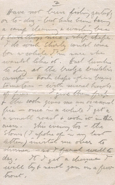 The weather is splendid now & one forgets all about the rain. Have not been fishing yesterday or to-day - but have been having a camp cleaning & washing bee & have things nice & ship shape. I do wish Shirley could come for a-while I'm sure she would like it. Had lunch to day at the bridge builder's camp - Pork chops - green beans - tomatoes - with several kinds of pies - I give them fish & the cook gives me the occasional pie - once in a while I get a small roast & cook it in their oven. This evening too - the Stones (I spoke of in my last letter) invited me over to dinner - so I fared well today. If I get the chance I will try & send you in a few trout.