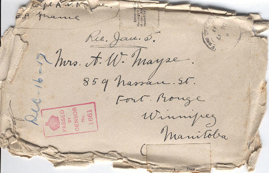 Sunday morning & Fritz's guns etc busy making their old music - last night we had just sat down to supper, when he began to drop bombs, it id not take us long to put out the lights & go outside to see where he was dropping them - he made a second visit about 12 midnight every day his shells come whissing & screaming over the marquee in which we are living to fall in the fields or town not far distant - Yesterday one shell hit & brought down a large crucifix with its image of the Christ (The Prince of Peace) yesterday I was walking through a near by town with a church when I met, whom do you think? Walter Gordon - he used to keep the Pharmacy in Neepawa he is a Cap't Quartermaster in one the Pioneer Battalions, we had quite a chat. The weather is keeping remarkably good for the time of year, though of course it is cold & damp.