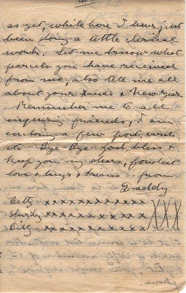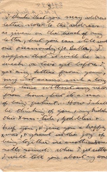 I think that you may address letters now to the address as given on the head of my letter, but you can still send one occasionally c/o Bella, I suppose that it will be a week or two yet before I get any letters from you, My - it seems such a long long time without any news from home, but its a case of being patient. How I shall be thinking of you & my kiddies this Xmas-time, God bless & keep you, & give you a happy Xmas, & grant us the joy of being together ere another Xmas rolls round. When I get settled I will tell you about my work as yet, while here I have just been doing a little clerical work. Let me know what parcels you have received from me, also tell me all about your Xmas & New Year.