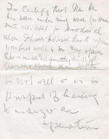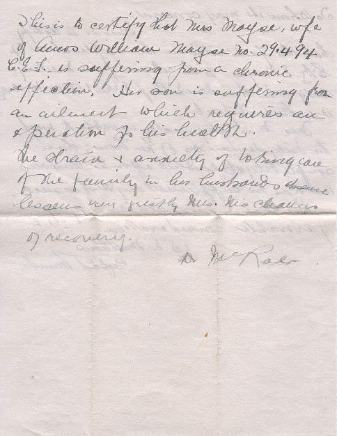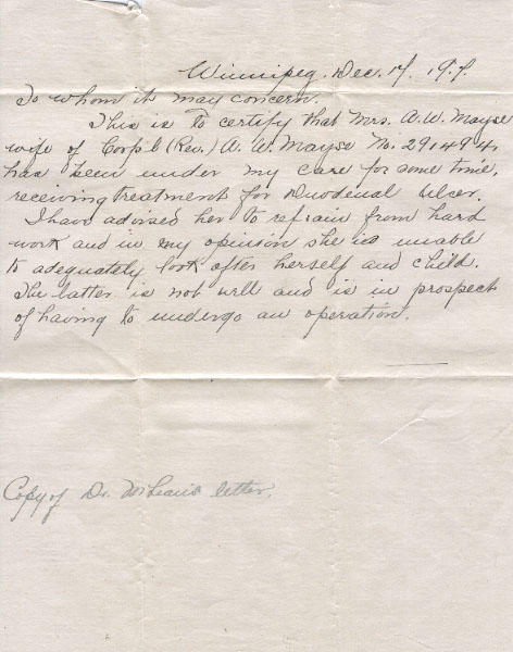 This is to certify that Mrs. A.W. Mayse wife of Corp'l (Rev) A.W. Mayse No. 291494, has been under my care for some time, receiving treatment for [?] ulcer.