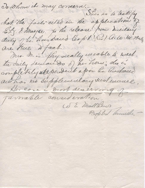 This is to testify that the facts cited in the application of Eliz. E. Mayse for the release from Military duty of her husband Corp'l (Rev) A.W.M. 291494 are true to fact.