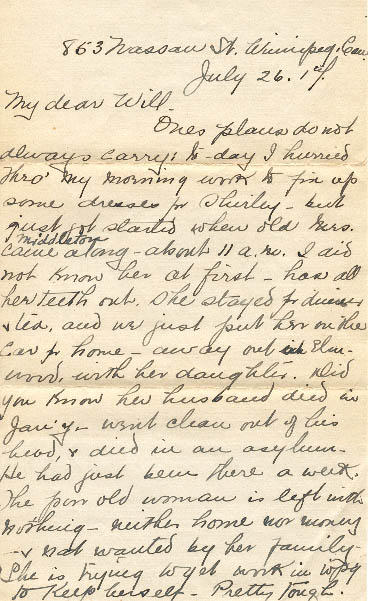 Ones plaus do not always carry: to-day I hurried thro' my morning work to fix up some dresses for Shirley - but just got started when old Mrs. Middleton came along - bout 11 a.m. I not know her at first - had all her teeth out. She stayed for dinner & tea, and we just put her on the car for home - away out in Elmwood, with her daughter. Did you know her husband died in Jan'y, went clean out of his head, & died in and asylum. He had just been there a week. The poor old woman in left with nothing - neither home now money - & not wanted by her family. She is trying to get work in Wnp to keep herself - Pretty tough. She seemed to enjoy her visit to-day - once in a while I had her laughing quite happy like. She may get a job cleaning offices at the C.P.R. - from 6 pm to 12 pm - $ 40.00 a month. I got quite a little Emerson news. I think Berry's have gone to Brandon - & Furtuly's are coming back to Emerson. Her visit took up all my day nearly. No letter from you to-day - guess the mail is not in yet. Mo letters at all since I wrote lat only one from Mrs. Foreman who will be home next week.