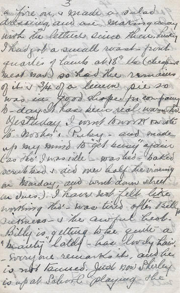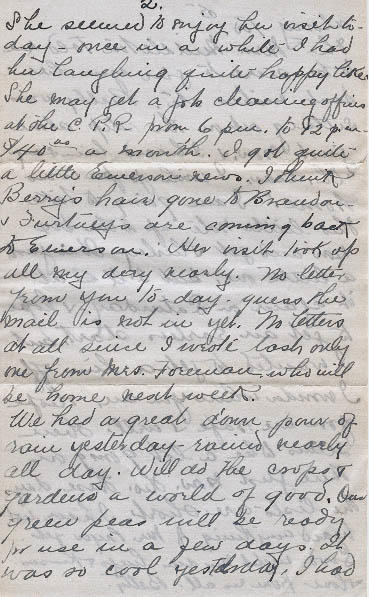 We had a great down-pour of rain yesterday - rained nearly all day. Will do the crops & gardens a world of good. Our green peas will be ready for use in a few days. It was so cool yesterday I had a fire on, & made a salad dressing, and are making away with the lettuce since then. Lucky I had got a small roast-front quarter of lamb at 18 cents lbs. (cheaper meat now) so had the remains of it & ¾ of a [?] pie so was in poor shape for company to-day. It has been real warm too. Yesterday I went to work & wrote to Mother & Ruby - and made up my mind to "get busy" again (as tho' I was idle - washed -baked - scrubbed & did over half the ironing on Monday, and went down street on Tues.) I have not felt like working tho' - was tired after Billy's sickness - & the awful heat. Billy is getting to be quite the "beauty" lately - has lovely hair, - everyone remarks it, and he is not tanned. Just now Shirley is up at School playing - she goes off all alone - & enjoys herself.