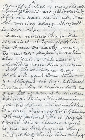 I'll have some more photos to send soon. When we slipped out to go to church Sunday Mr. Foreman took 2 of us all - & some of the children I think: Miss [?] got the film, & had us taken. We are having a lot of snaps. Thorey phoned last night & said she & Anna would be over on Sunday - so they will likely have their Kodak along too.