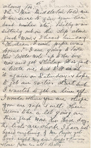 Oh - Mrs. Middleton told me to be sure to give you her best wishes etc. Billy was sitting out on the step alone just now, & I heard him say "Oh, dear, I wish papa was home." I am going to take this little not up to the box now and get Shirley. It is just a little one, but I'; be at it again on Saturday - & hope to get an earlier start, but I wanted to get a line off- I wonder where you are, I hope you are safe & well. There seems to be a lot going on there just now. Tho' these days the lists are short, I have not heard anything of Mr. Pryor yet. Good-night my dear, hugs & kisses & love from us all.