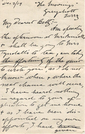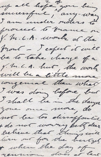 I have heard nothing in regard to your application to get me home & as I have been disappointed on my own efforts, I have given up all hope of your being successful, any-way I am under order to proceed to France on Y.M.C.A. work at the Ffront - I expect it will be to take charge of a Y.M.C.A but, the work will be a little more congenial than what I was doing before, but I shall be in the danger zone once more, do not be in too disappointed & do not worry Betty dear believe that things will turn out for the best yet, & when the day of reunion does at last come our joy will be the greater. I leave Bramshott on Tuesday Dec 4th /17 for Shorncliffe & from there I shall go to France - I do not know as yet what part of the line I shall be in, but I will endeavour to write as often as possible & keep you posted as to my where-about