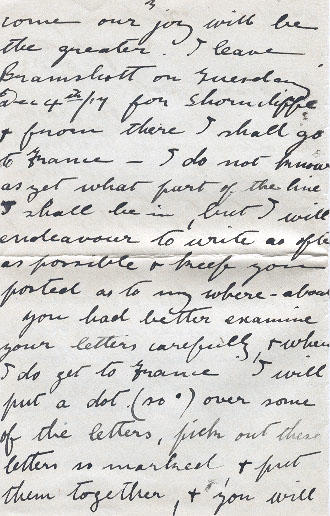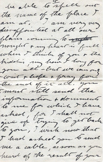 You had better examine your letters carefully & when I do get to France I will put a dot (so . ) over some of the letters, pick out these letters so marked & put them together, & you will be able to spell out the name of the place I am at. I am very very diss-appointed at all our plans coming to nought & my heart is full when I think of you & the kiddies, my how I long for you all - but we can only wait & hope & pray for the end of it all. You must still send the information & documents to me for which I have asked, for I shall not give up trying to get back to you, I wish now that I had asked you to send me a cable, as soon as you heard of the result of your application.