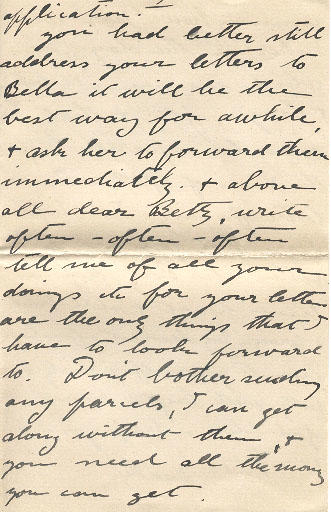 You had better still address your letters to Bella it will be the best way for awhile, & ask her to forward them immediately. & above all dear Betty, write often - often - often tell me all of your doings etc for your letters are the only things that I have to look forward to. Don't bother sending any parcels, I can get along without them, & you need all the money you can get.
