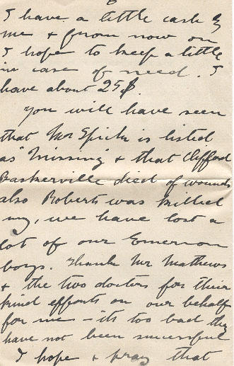 You will have seen that Mr. Spicker[?] is listed as "Missing" & that Cliffod Baskeville died of wounds also Roberts was killed my, we have lost a lot our Emerson boys. Thank Mr Mathews & the two doctors for their kind efforts on our behalf for me - its too bad they have not been successful