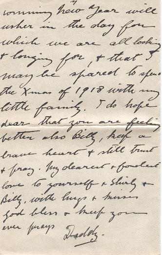 I hope & pray that comming New Year will usher in the day for which we are all looking & longing for, & that I may be spared to spend the Xmas of 1918 with my little family, I do hope dear that you are feeling better also Billy, keep a brave heart & still trust & pray. My dearest & fondest love to yourself & Shirley & Billy, with hugs & kisses God bless & keep you ever prays