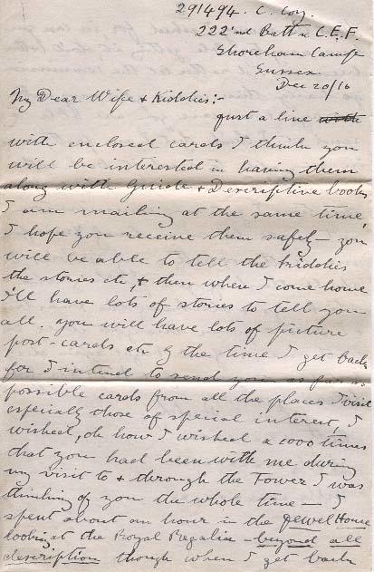 Just a line with enclosed cards I think you will be interested in having them along with Guide & Descriptive books I am mailing at the same time, I hope you receive them safely - you will be able to tell the kiddies the stories etc, & then when I come home I'll have lots of stories to tell you all. You will have lots of picture post-cards etc by the time I get back for I intend to send you as far as possible cards from all the places I visit especially those of special interest, I wished, oh how I wished a 1000 times that you had been with me during my visit to & through the Tower I was thinking of you the whole time - I spent about an hour in the Jewel House looking at the Royal Regalia - beyond all description though when I get back I'll try and tell you about it all. I was also thinking about you when I was walking down Bond St & Piccadilly the home of Fashion & my you should have seen the fashions = short skirts = nobly hats - big muffs & little poodle dogs - I fancy you dressed like some of them - you would have enjoyed it all especially looking in the shop windows = Hatton Garden the place where all the 1st class jewelers etc are was specially interesting windows all ablaze with jewels - diamonds etc - etc, rings - necklaces - coronets - broaches from a few pounds ( £1) in price to 1000'nds of pounds.
