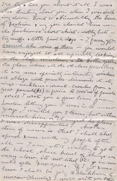 Well I wrote you a few lines from London telling you I was in to meet George, I waited for 3 trains, but either missed him or he changed his plans. I was dissappointed. Another item of news in that I shall likely spend Xmas with people after all - I am still waiting to go to the school, these kind of things are very slow, its not likely I'll go in now until after New Years. if I get Xmas leave I shall be going to Blackburn tomorrow (Thursday) I will write you from there.