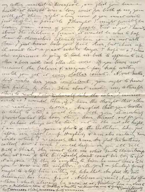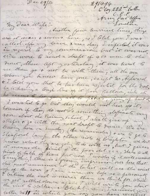 Another few hurried lines, things are at sixes & sevens here, as I told you I was called off my leave x mas day I expected it was in regard to my commission but it was not. We were to send a draft of 450 men to the Front, these left yesterday, it was hard to see them go & not be with them, all the men whom you knew have gone, except Mr Aylward & I told you that he has been rejected for the Front he is having a tough time of it poor fellow, sick etc he seems to be going all to pieces, giving up heart [?]. I wanted to go but they would not hear of it, however if they do not do something definite very soon about the Training School, I shall give up my stripes & go with the next draft to France. We are leaving here on Sunday (the remainder) & are to go to Sleaford Camp the other side of Brighton, we don't know what they are going to do with us, but I guess it means the finish of the poor old 222. There is all kinds of talk of Peace just now I wonder if it will ammount to anything? there is a growing impression over here that this next summer at the latest will see the wind up of the war, & I am sure we hope so - personally I believe the end is nearer than we think for. When we get settled down again I will write you about the visit to Oldham & Blackburn. I received your letter No 11 in which you say you have received my letter mailed in Liverpool, am glad you have hear at last, it was a long wait for both of us, you will get them right along now, & you must write just as often as possible I thought I might possibly be hearing from some of your people but as yet I haven't about the children and the Gunns, it would be wise to keep them to themselves especially when you are not with them, I just know how you feel dear, but cheer up it won't last a great while longer I hope - & I believe this experience is going to teach us both to appreciate each other & bear with each other the more. If you have not received the balance of the assigned pay keep writing until you get it every dollar counts. About Mattie don't make her your confident, you ought to know her failing by this. Then about sending my letters for others to read, I don't hardly like the idea, I cannot write as I would like, if I have the thought that others are reading my letters. Am glad that your Mother is likely to stay a good time with you, it is certainly providential the way things have turned out for you, & I believe things will turn out in the end all right. I am mailing you a photo of the Battalion taken just before we left Camp Hughes, & am also enclosing Xmas cards which I received this Xmas. Am glad Mr Mathews called. How I wish I could drop in on you all Tell Billy & Shirley they must tell me what Santa Claus brought them at Xmas, & tell Billy, Daddy doesn't want his boy to spit at anyone - If they do anything to him he must come & tell you - How are the neighbours with you? = Stanley's parents ought to stop him cutting up like that. Am glad the Note business has been fixed. Address my mail Army Post Office & then I shall always be sure of it. Fondest Love my dera to you & kiddies - love to Mother & Mattie remember me to Gunns.