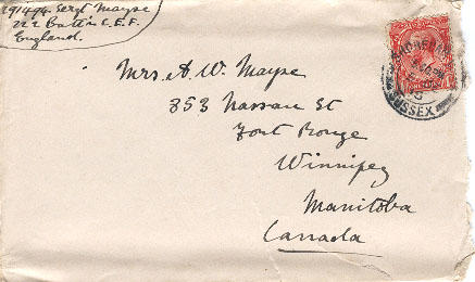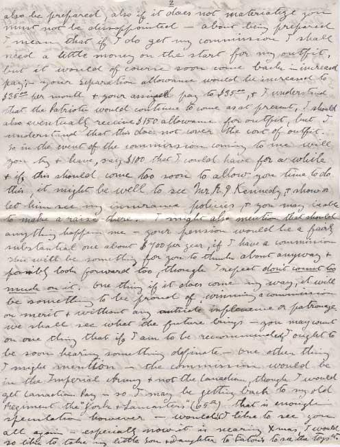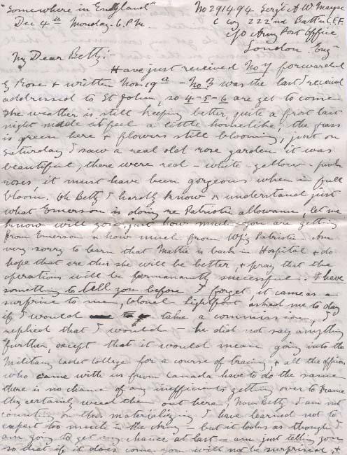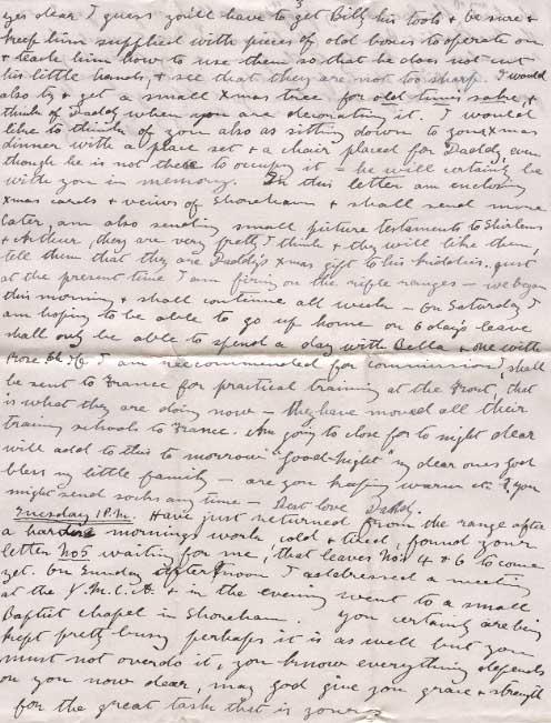 Have just received No 7 forwarded by Rose & written Nov 19th - No 3 was the last I received addressed to St John, so 4 - 5 - 6 are yet to come The weather is still keeping better quite a frost last night made it feel a little homelike, the grass is green here & flowers still blooming, just on Saturday I saw a real old rose garden it was beautiful, there were red - white - yellow - pink roses, it must have been gorgeous when in full bloom. Oh Betty I hardly know or understand just what Emerson is doing re Patriotic Allowance, let me know will you, just how much you are getting from Emerson & how much from Wp'g Patriotic. Am, very sorry to learn that Mattie is back in Hospital & do hope that ere this she will be better, & pray that the operations will be permanantly successful. I have something to tell you before I forget, it came as a surprise to me, Colonel Lightfoot asked me to day if I would take a commission, I replied that I would - he did not say anything further, except that it would mean going into the Military Cadet College for a course of training, & all the officers who came with us from Canada have to do the same there is no chance of any inefficients getting over to France they certainly weed them out here, Now Betty I am not counting on this materializing I have learned not to expect too much in the Army - but it looks as though I am going to get my chance at last - am just telling you so that if it does come you will not be surprised & also be prepared, also if it does not materialize you must not be disappointed - about being prepared I mean that if I do get my commission I shall need a little money on the start for my outfit, but it would of course soon come back in increased pay;- your separation allowance would be increased to $35ºº per month & your assigned pay to $35ºº, & I understand that the Patriotic would continue to come as at present, I should also eventually receive $150 allowance for outfit, but I understand that this does not cover the cost of the outfit. So in the event of the commission coming to me will you try & leave, say $100 that I could have for a while & if this should come too soon to allow you time to do this, it might be well to see Mr R.D. Kennedy, & show or let him see my insurance policies, & you may be able to make a raise there. I might also mention that should anything happen me - your pension would be fairly substantial one about $700 per year, if I have a commission. This will be something for you to think about anyway & possibly look forward too, though I repeat don't count too much on it. One thing if it does come my way, it will be something to be proud of, winning a commission on merit & without any outside influence or patronage we shall see what the future brings - you may count on one thing that if I am to be recommended, I ought to be soon hearing something definate - One other thing I might mention - the commission would be in the Imperial Army & not the Canadian, though I would get Canadian Pay - so I may be getting back to my old Regiment the "York & Lancasters" (65th) that is enough speculation however - wouldn't I like to see you all again - especially now it is nearing Xmas, I would so like to take my little Son & Daughter to Eaton's to see the toys yes dear I guess you'll have to get Billy his tools & be sure & keep him supplied with pieces of old boxes to operate on & teach him how to use them so that he does no cut his little hands, & see that they are not too sharp. I would also try & get a small Xmas tree for old times sake, & think of Daddy when you are decorating it. I would like to think of you also as sitting down to your Xmas dinner with a place set & a chair placed for Daddy, even though he is not there to occupy it = he will certainly be with you in memory. In this letter am enclosing Xmas cards & views of Shoreham & shall send more later, am also sending small picture testaments to Shirlems & Arthur, they are very pretty I think & they will like them. tell them that they are Daddy's Xmas gift to his kiddies. Just at the present time I am firing on the rifle ranges - we began this morning & shall continue all week - On Saturday I am hoping to be able to go up home on 6 day's leave shall only be able to spend a day with Bella & one with Rose. Oh If I am recommended for commission I shall be sent to France for practical training at the Front, that is what they are doing now - they have moved all their training schools to France. Am going to close for to night dear will add to this to morrow "Good-Night" my dear ones God bless my little family - are you keeping warm etc? You might send socks any time - Best love Daddy.