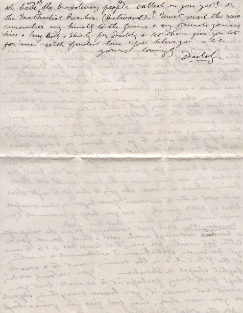 Tuesday 1 P.M. Have just returned from the range after a hard mornings work, cold & tired, found your letter No 5 waiting for me, that leaves No's 4 & 6 to come yet. On Sunday afternoon I addressed a meeting at the Y.M.C.A. & in the evening went to a small Baptist Chapel in Shoreham. You certainly are being kept pretty busy perhaps it is as well but you must not overdo it, you know everything depends on you now dear, may God give you grace & strength for the great task that is yours. Oh have the Broadway people called on you yet? or the Methodists Preacher (Hatwood).? Must mail this now Remember my kindly to the Gunns & any friends you see kiss & hug Billy & Shirley for Daddy & let them give you lots for me with fondest love God bless you all