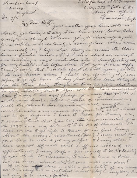 Just another few lines with enclosed, yesterday & to day have been wet, but it looks to night as though it were going to clear up again for a while - it certainly is some place when it rains so muddy etc. I hope dear that you receive the Shoreham & London veiws which I sent also Xmas cards, I am enclosing a card with this also a handkerchief each for the kiddies, I do hope dear that you have a Happy Xmas, I wish that I could spend it with you, as it is I do not know where I shall be spending it, I was hoping to go up home today, but it has been delayed for the time being, though it is possible that I may be going Saturday Dec 16th. You will also have received my letter of a day or two ago (perhaps you may get them at the same time) in which I spoke of commission, well the colonel has recommended me for a commission & my name has gone in (to war office) so it should not be long before I have to leave for training etc, I understand that 6 are being recommended from the 222nd & am very fortunate to be one of them, also I believe we are to go right to France for our final training.