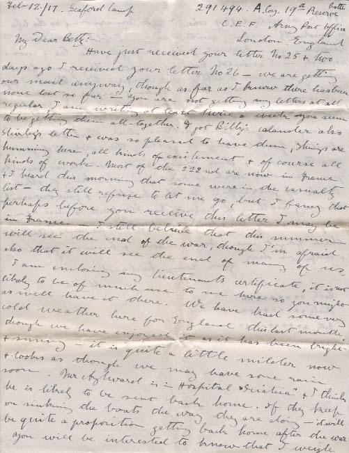 Have just received your letter No 25 & two days ago I received your letter No 26 - we are getting our mail anyway, though as far as I know there has been none lost so far - you are not getting my letters at all regular, I am writing at least twice a week you seem to be getting them all-together. I got Billy's calendar also Shirley's letter & was so pleased to have them, Things are humming here, all kinds of excitement & of course all kinds of work. Most of the 222nd are now in France & I heard this morning that some were in the casualty list - they still refuse to let me go, but I fancy that perhaps before you receive this letter I may be in France - I still believe that this summer will see the end of the war, though I'm afraid also that it will see the end of many of us. I am enclosing my lieutenants certificate, it is not likely to be of much use to me here so you might as well have it there. We have had some very cold weather here for England this last month though we have enjoyed it as it has been bright & sunny - it is quite a little milder now & looks as though we may have some rain soon. Mr Aylward is in Hospital [?] & I think he is likely to be sent back home. If they keep in sinking the boats the way they are doing - it will be quite a proposition getting back home after the war You will be interested to know that I weigh 158 lbs, as against 139 when I left Emerson, so the life is evidently agreeing with me. I told you about receiving your parcel & am enjoying the tea & cocoa &socks etc - I would hold up on the dry goods for a while, & send me a little shortbread - tea & tobacco. I hope that I shall not need many more of them. No I have not heard from any of your people but as I have so little time to write its just as well, as long as I get your letters dear thats all I care about. You'll soon be getting the coldest of you weather over & then things will not be so heard for you. Now don't work so hard, & in thinking of others think of yourself - for the children's & your own sake to say nothing of mine. Now I'll have to close again to go on duty. Kiss & hug the children for me & don't let them forget me. Fondest love & kisses God bless & keep you dear.