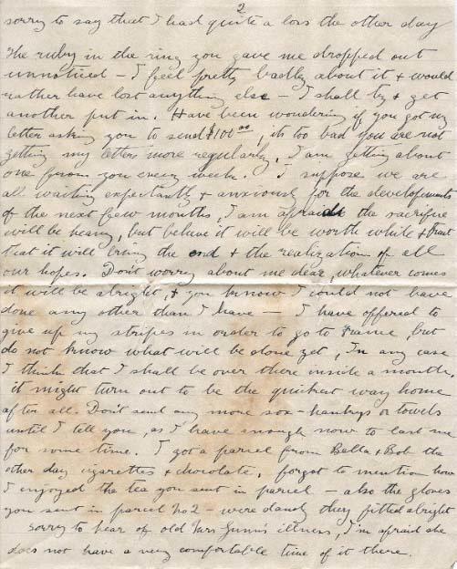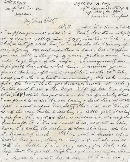 Well my dear it is 11 am as I write & I suppose you will still be in bed about 5 am with you we are have a spell of rainy - foggy weather which is likely to last for some time, it is like this the beginning of every spring our cold weather is past, but I suppose you are still in the grip of yours, for the present I am acting Serg't Major of the company so consequently am kept pretty busy the whole time. I received your parcel No. 3 in splendid condition on the 20th Feb, & enjoyed the contents immensely, the cake was fine, the best I think you have ever made - it certainly tasted good to me & the boys. I left off here to read your letter (No 28) which has just come - also one from Ruby which I was pleased to receive they are having a hard time of all right. I must confess dear Betty that I do not like to hear of the way Mattie is treating my little girl, it certainly is far from being right, & there is no reason in it & no justification for it, & it is an insult to us, as well as doing harm to & hurting the feelings of dear Shirlems, who has the kindest of hearts - I'll be glad to know when Mattie has gone, though I hope & trust she will be better. I am very sorry for Ruby & do hope that things will brighten & get easier for them. I shall try & write her to day. Oh I am very sorry to say that I had quite a loss the other day. The ruby in the ring you gave me dropped out unnoticed - I feel pretty badly about it & would rather have lost anything else - I shall try & get another put in. Have been wondering if you got my letter asking you to send a $ 100.ºº, its too bad you are not getting my letters more regularly, I am getting about one from you every week. I suppose we are all waiting expectantly & anxiously for the developments of the next few months, I am afraid the sacrifice will be heavy, but believe it will be worth while & trust that it will bring the end & realization of all our hopes. Don't worry about me dear, whatever comes it will be alright, & you know I could not have done any other than I have - I have offered to give up my stripes in order to go to France, but do not know what will be done yet. In any case I think that I shall be over there inside a month it might turn out to be the quickest way home after all. Don't send any more sox-hankys or towels until I tell you, as I have enough now to last me for some time. I got a parcel from Bella & Bob the other day cigaretts & chocolate, forgot to mention how I enjoyed the tea you sent in parcel - also the gloves you send in parcel no 2 - were dandy they fitted alright.