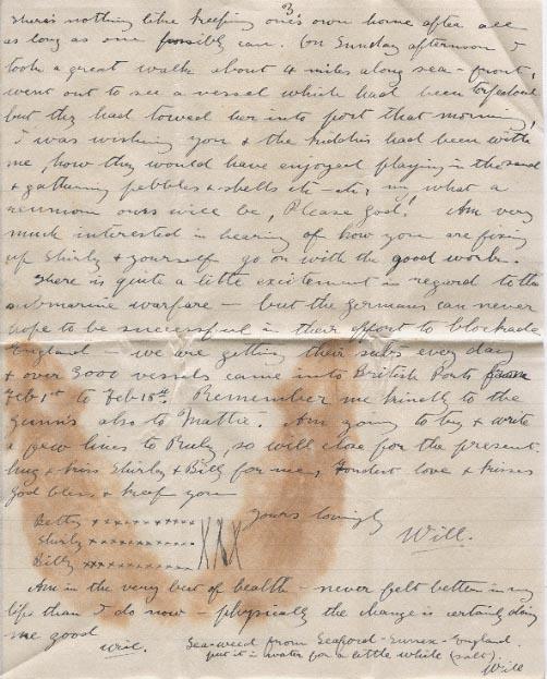 There is quite a little excitement in regard to the submarine warfare - but the Germans can never hope to be successful in their effort to blockade England - we are getting their subs every day + over 3000 vessels came into British Ports from Feb 1st to Feb 18th. Remember me kindly to the Gunn's also to Mattie. Am going to try & write a few lines to Ruby, so will close for the present hug & kiss Shirley & Billy for me, fondest love & kisses. God bless & keep you