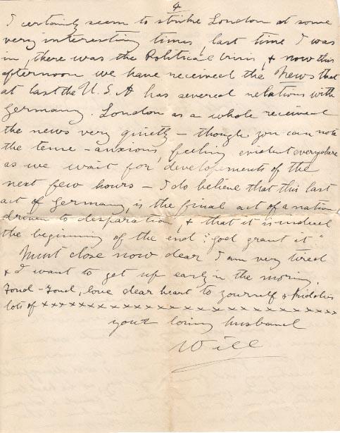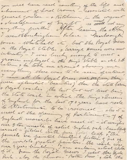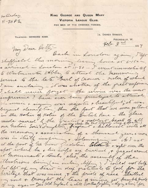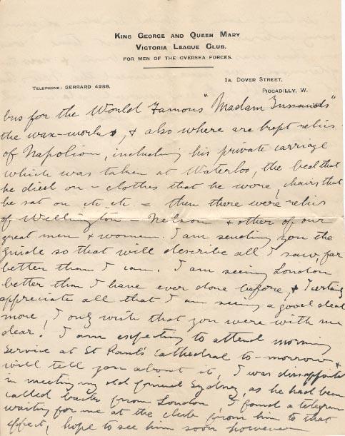 Back in London again, I left Sheffield this morning, leaving home at 6-15 am. & arrived in London at 11-30 - I went immediately to Westminster Abbey to attend the Memmorial Service to the late Earl of Cromer - order of which I am enclosing - it was another of the great experiences I shall never forget - the service was the most impressive I have ever been privileged to attend. The music & singing was majestic & beautiful; it was beyond description; then the fact that we were gathered in the Holies of Holies of the British Race - the place made sacred by the greatest & noblest hearts of all our Nation's Sons & Daughters (as they sleep the last majestic sleep of death) fragrant & hallowed with all the memory & association of a thousand years & more was in itself inspiring & solemnizing - As I sat at the front of Mr Ewart Gladstone's statue & right over the spot where he & his wife are burried, & gazed around at Monuments & tombs, also at the assembly of the illustrious living (am enclosing clipping) I could not help but lift up my heart in deep gratitude to God, for the heritage that was mine, & the pride of race thrilled my soul & brought the tears of sincere yet humble pride to my eyes = Yes Old England is still worth fighting - dying & living for you will have read something of the life and achievement of Lord Cromer - associated with General Gordon - & Kitchener in the conquest & development of Egypt. so need not say anything further. After leaving the Abbey I went to Buckingham Palace - Marborough House - Whitehall etc, but the Royal Mews on the Royal Stables & Carriage Houses were most interesting - I was lucky enough to meet a groom employed in the King's Stables and old S.A. veteran & he took me around showing me everything there was to be seen of interest, I saw all the Royal Horses, over 100 (my they were splendid - beauties) then the state harnesses & Royal Coaches, the last but not least being the State Coach in which the Kings & Queens of England for the last 170 years have rode to Westminster to be crowned - also it is used at the opening of Parliament - 7 of England's monarchs have used it - it weighs over 3 tons, made of solid English oak - beautifully carved - gilded with pure gold leaf & on the pannels are painted beautiful pictures by one of the worlds greatest painters. the coach was over 3 years building, I am enclosing actual photos of it, From the Royal Mews I went thro Hyde Park - along the famous "Rotten Row" & took the bus for the World Famous "Madam Tussauds" the wax-works, & also where are kept relics of Napolion, including his private carriage which was taken at Waterloo, the bed that he died on - clothes that he wore, chairs that he sat on etc etc = then there were relics of Wellington - Nelson & other of our great men & women. I am sending you the guide so that will describe all I saw, far better than I can. I am seeing London better than I have ever done before, & I certainly appreciate all that I am seeing as good deal more, I only wish that you were with me dear. I am expecting to attend morning Service at St Paul's Cathedral to-morrow & will tell you about it, I was disappointed in meeting my old friend Sydney, as he had been called back from London, I found a telegram waiting for me at the club from him to that effect, hope to see him soon however I certainly seem to strike London at some very interesting times. last time I was in, there was the Political Crisis, & now this afternoon we have received the News that at last the U.S.A has severed relations with Germany. London as a whole received the news very quickly - though you can note the tense-anxious, feeling evident everywhere as we wait for developments of the next few hours - I do believe that this last act of Germany, is the final act of a nation driven to desparation, & that it is indeed the beginning of the end "God grant it."
